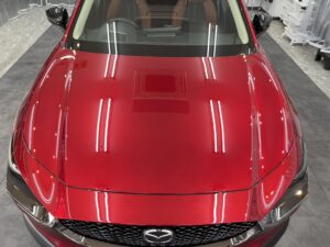 CX-30はSUVらしい存在感を維持しつつも、スタイリッシュなデザインで特に、ボディを斜め横から見た際には、リフレクションによってS字のように光が入る様が、美麗かつ躍動感のある車です、ロイヤルコーティングでさらに輝き美しさが増しました。
